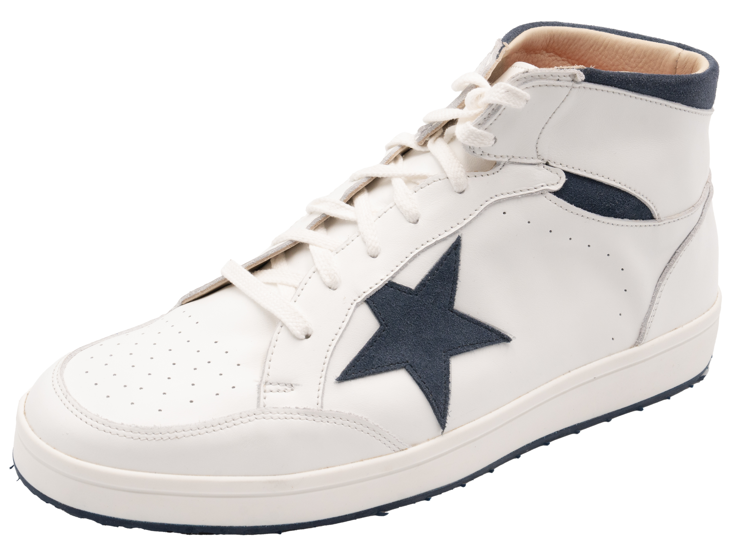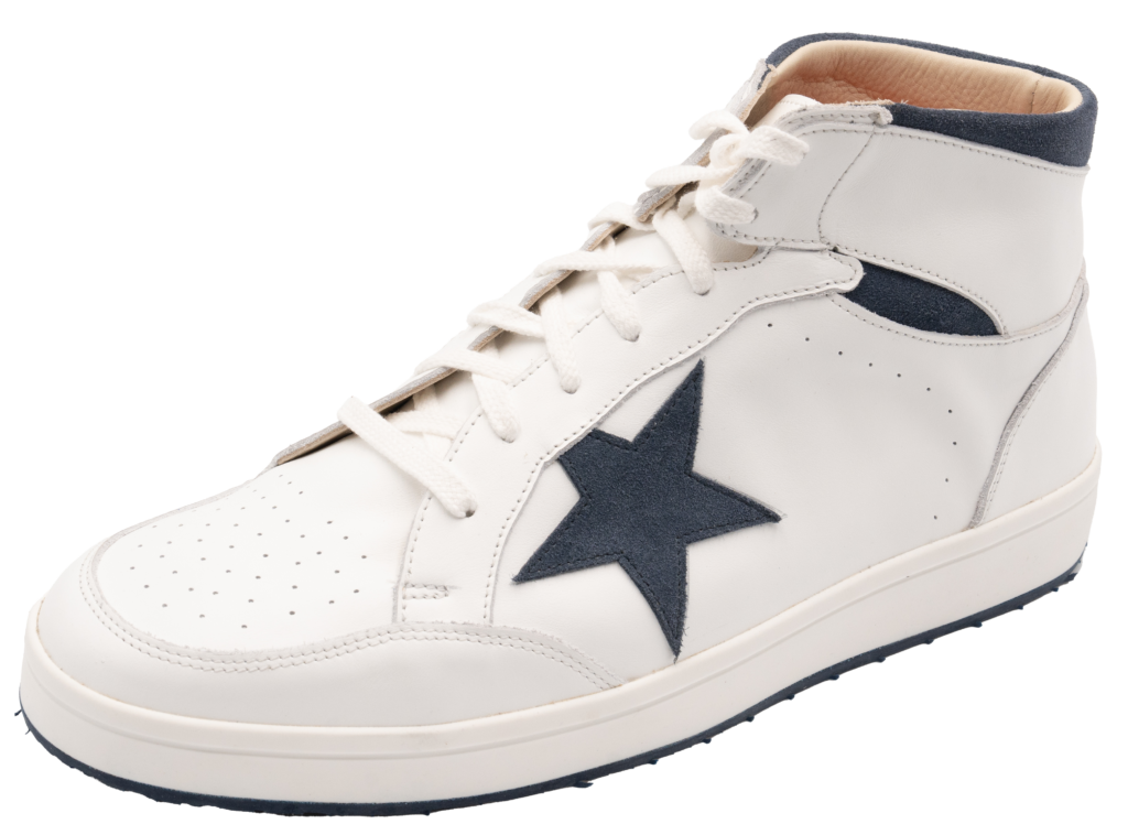 Explorez l'élégance décontractée avec notre chaussure haut de gamme qui marie le raffinement du cuir lisse blanc à la profondeur de la croûte indigo. Cet assemblage sélect est conçu pour ceux qui recherchent une qualité supérieure et un confort orthopédique, tout en affichant une silhouette chic et tendance.